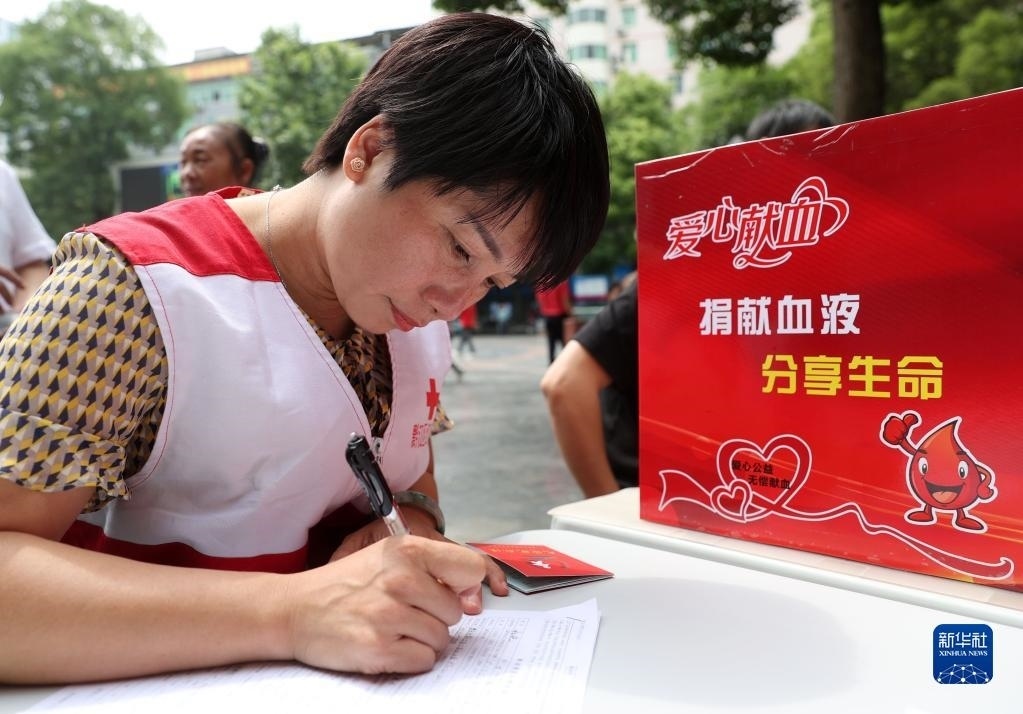 6月14日,志愿者在重慶市黔江區(qū)獻血愛心屋填寫無償獻血信息。   新華社發(fā)(楊敏攝)