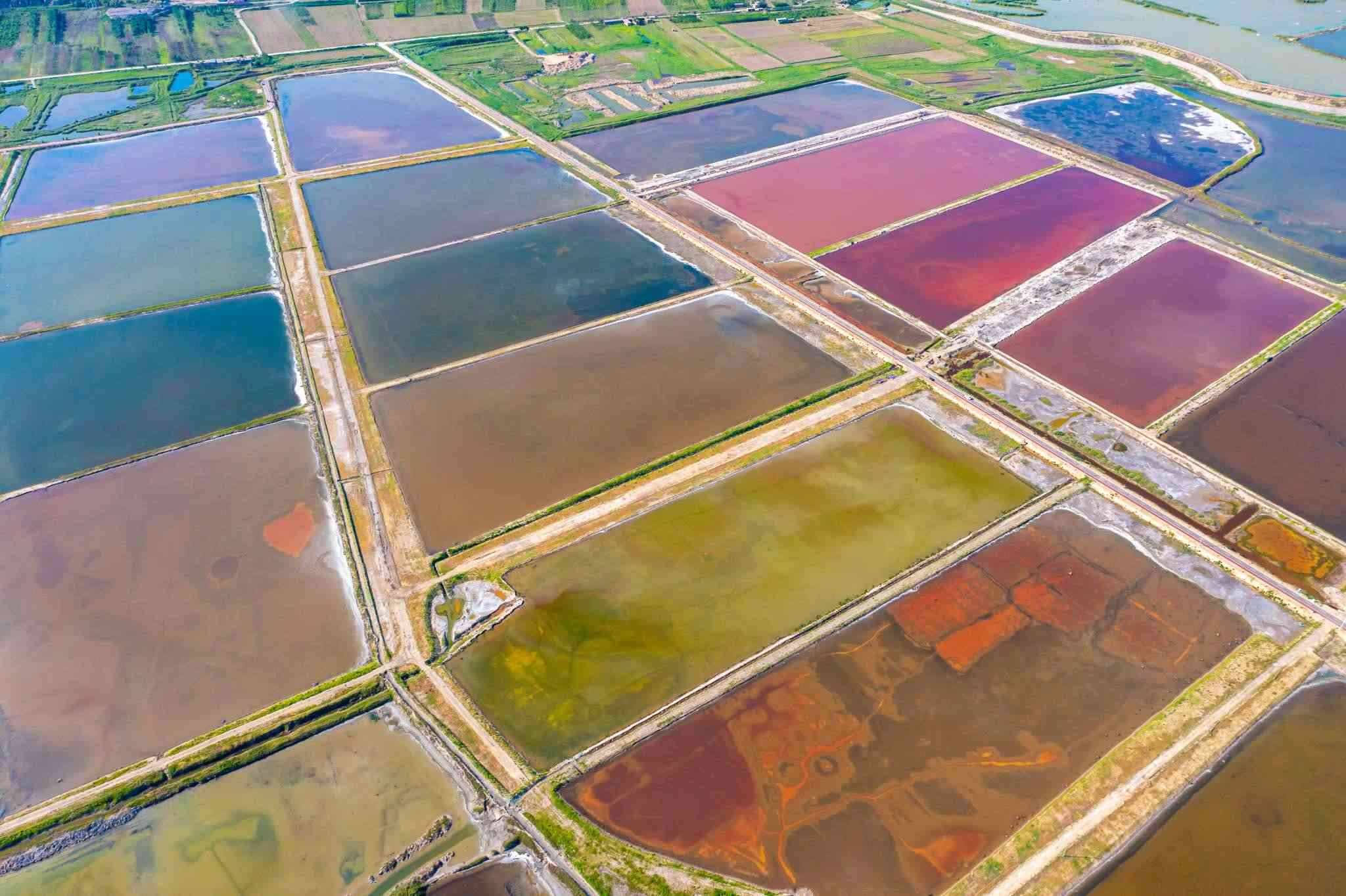 2023年6月14日,山西運(yùn)城,七彩鹽湖呈現(xiàn)出色彩斑斕的景觀,猶如大地調(diào)色板,美不勝收。視覺中國