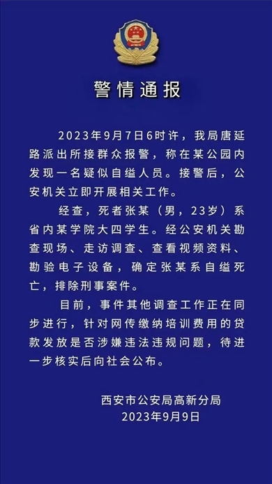 ·西安高新警方通報“大四學(xué)生自縊身亡”:排除刑案,正進一步核實網(wǎng)傳貸款問題。