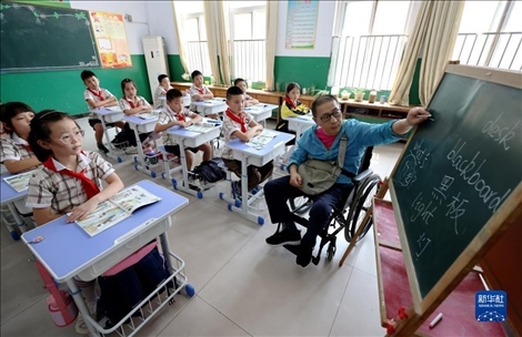 今年48歲的楊季剛是山東省棗莊市永安鎮(zhèn)遺棠小學(xué)一名鄉(xiāng)村教師,從教已28年。2017年初,楊季剛因意外摔成重傷,終生將與輪椅為伴??恐B強的毅力,歷經(jīng)康復(fù)訓(xùn)練的艱辛,2018年秋季楊季剛?cè)缙诨氐搅诵@,在特制1米高的小黑板上頑強地續(xù)寫他的教師生涯。