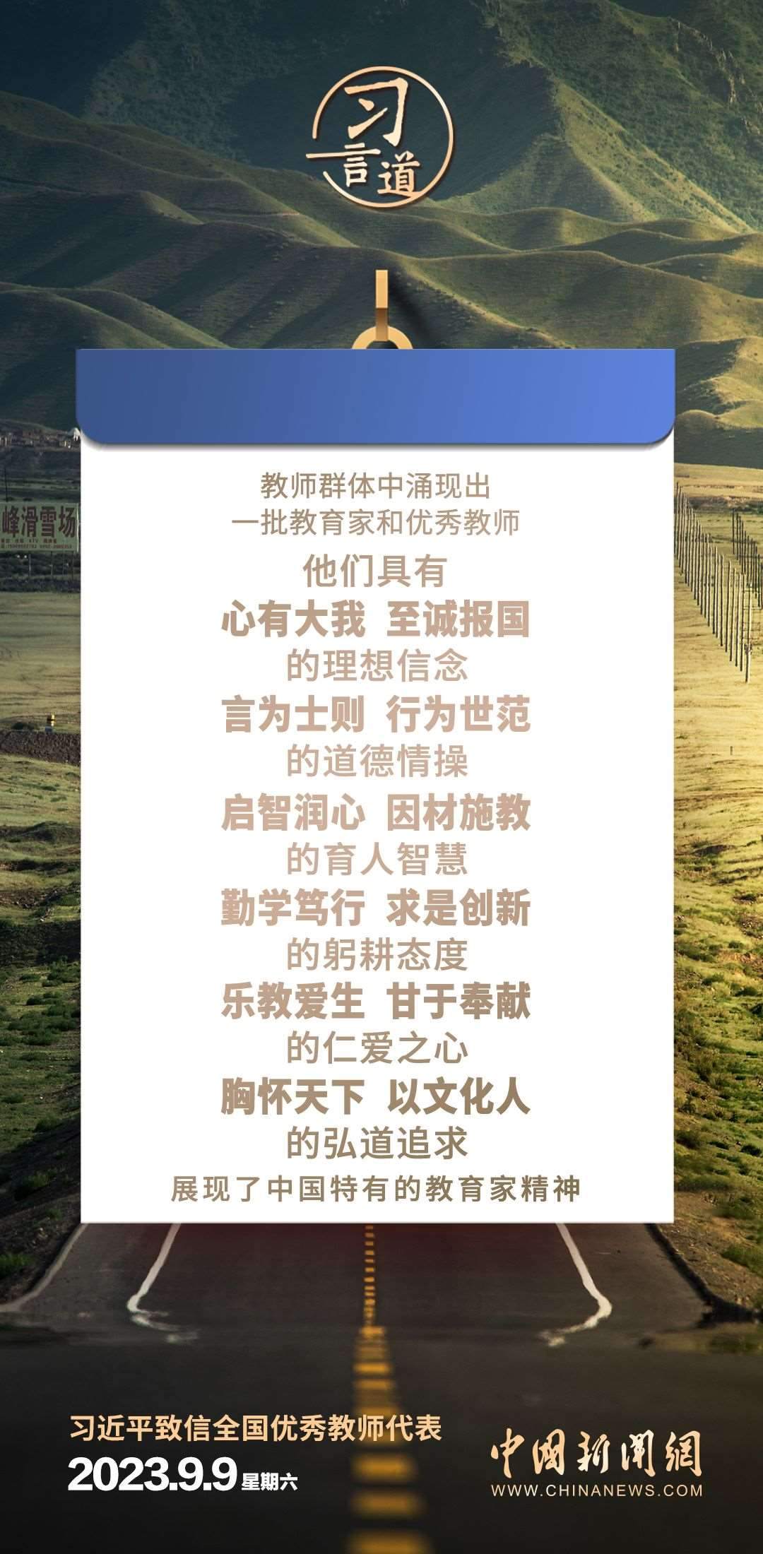 全國(guó)優(yōu)秀教師代表座談會(huì)9月9日在京召開(kāi)。中共中央總書(shū)記、國(guó)家主席、中央軍委主席習(xí)近平致信與會(huì)教師代表,在第三十九個(gè)教師節(jié)到來(lái)之際,代表黨中央,向他們和全國(guó)廣大教師及教育工作者致以節(jié)日的問(wèn)候和誠(chéng)摯的祝福。習(xí)近平指出——