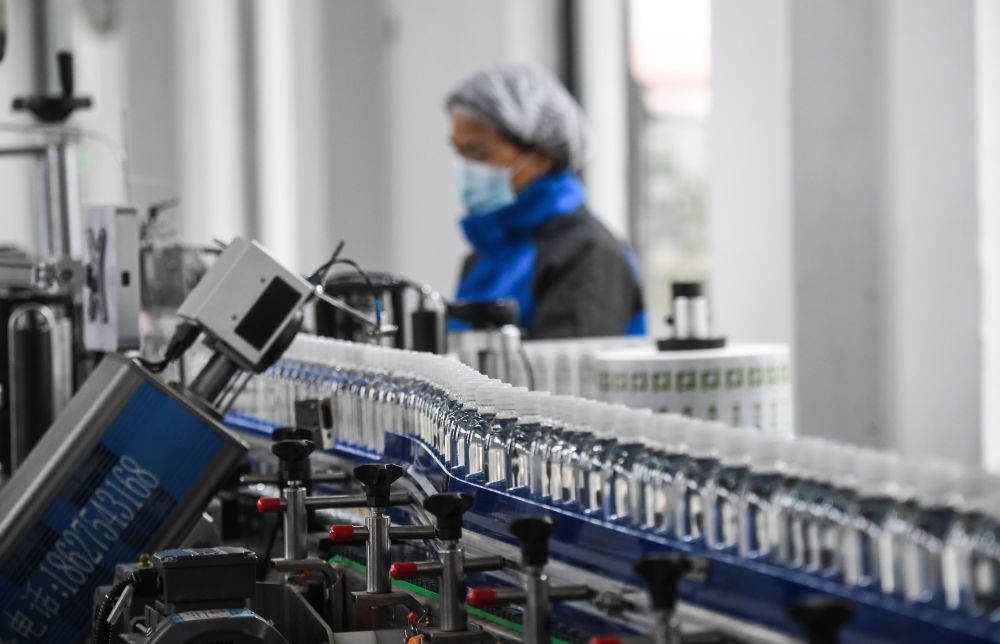 在浙江淳安經(jīng)濟(jì)開發(fā)區(qū)一家水飲料企業(yè)拍攝的瓶裝水生產(chǎn)線(2020年12月8日攝)。新華社記者 徐昱 攝