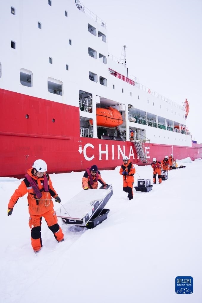 北京時間5日上午10時,作業(yè)結(jié)束。上船稍事休整,考察隊全體成員下到冰面拍攝大合影。合影間隙,科考隊員三五成群,舉著臨時制作的標(biāo)語橫幅,在“雪龍2”號前拍照留念。