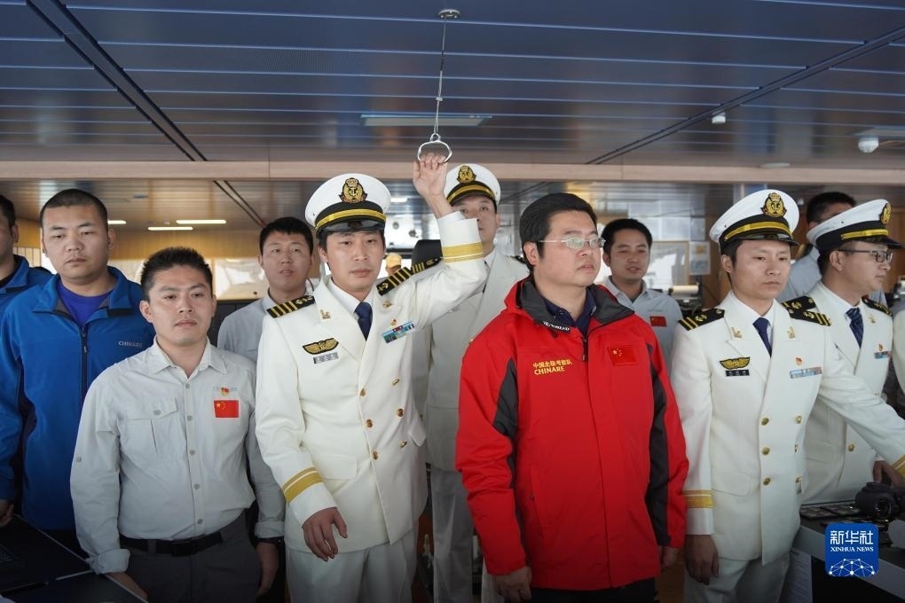 報告聲響徹駕駛臺,“雪龍2”號船長肖志民旋即拉響汽笛。接著,“雪龍2”號停止前行,中國第13次北冰洋科學(xué)考察隊領(lǐng)隊王金輝走向廣播臺,通過全船廣播宣告——