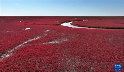 近日,遼寧省盤錦紅海灘國家風景廊道內的堿蓬草迎來最佳觀賞期,吸引了眾多游客前來觀賞游玩。