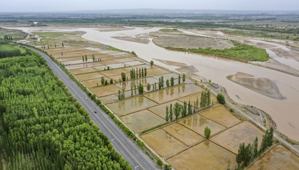 流經(jīng)寧夏青銅峽市境內(nèi)的黃河,滋潤著岸邊水稻和各種植被(無人機(jī)照片,5月25日攝)。新華社記者馮開華 攝