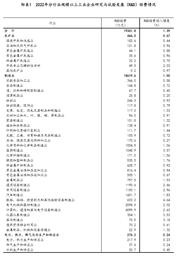 分產(chǎn)業(yè)部門看,高技術(shù)制造業(yè)研究與試驗發(fā)展(R&D)經(jīng)費6507.7億元,投入強度(與營業(yè)收入之比)為2.91%,比上年提高0.20個百分點。在規(guī)模以上工業(yè)企業(yè)中,研究與試驗發(fā)展(R&D)經(jīng)費投入超過千億元的行業(yè)大類有7個,比上年增加2個,這7個行業(yè)的經(jīng)費占全部規(guī)模以上工業(yè)企業(yè)研究與試驗發(fā)展(R&D)經(jīng)費的比重為63.2%(詳見附表1)。