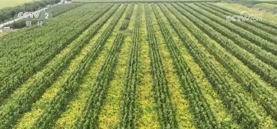除了高密度種植,今年她家還有220畝采取了大豆玉米帶狀復(fù)合種植。你看對(duì)面的這片田就是,四行玉米間隔著六行大豆,這是按照當(dāng)?shù)剞r(nóng)機(jī)的大小和寬度調(diào)整的種植寬度,玉米喜光大豆耐蔭,一高一矮套種互不影響,同時(shí)又能更加土地的利用率。