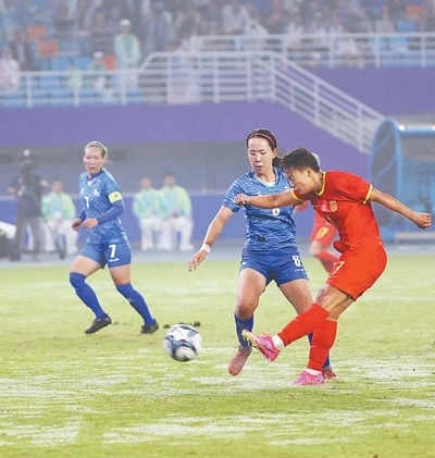 9月22日,亞運(yùn)女足小組賽,中國女足以16∶0戰(zhàn)勝蒙古國女足。圖為隊(duì)員在比賽中。本報(bào)記者 張武軍攝