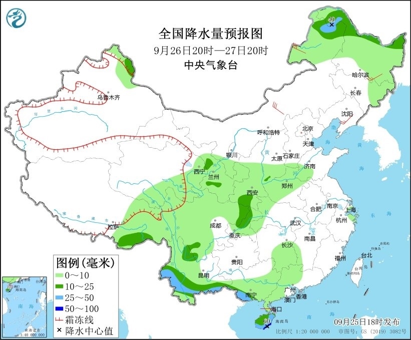 9月25日20時(shí)至26日20時(shí),廣東西南部、廣西南部、海南島以及新疆北疆北部、西藏東南部、陜西南部等地部分地區(qū)有中到大雨,其中,海南島東部和南部等地部分地區(qū)有暴雨或大暴雨(100~180毫米)。另外,新疆阿勒泰山區(qū)有雨夾雪或雪。內(nèi)蒙古中西部、山東半島等地部分地區(qū)有4~6級(jí)風(fēng)(見圖1)。