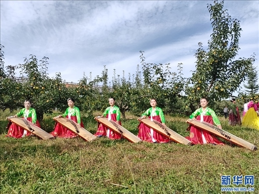 蘋果梨樹(shù)下的演奏 ?黃維攝/新華網(wǎng)發(fā)
