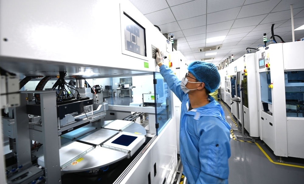 在杭州市富陽區(qū)春江街道富春灣新城的杭州正銀電子材料有限公司的研發(fā)實(shí)驗(yàn)室內(nèi),自動(dòng)化設(shè)備在進(jìn)行光伏板的絲網(wǎng)印刷(3月22日攝)。新華社記者 徐昱 攝