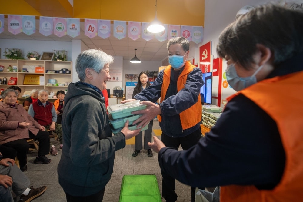 杭州市上城區(qū)南星街道白塔嶺社區(qū)志愿者在社區(qū)服務(wù)驛站為老人發(fā)放免費(fèi)愛心午餐(2022年11月23日攝)。新華社記者 江漢 攝