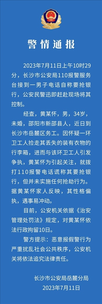 ·一人因與環(huán)衛(wèi)工人引發(fā)爭(zhēng)執(zhí),為引起關(guān)注,撥打110報(bào)警電話謊稱要搶銀行。長(zhǎng)沙警方通報(bào),對(duì)其依法行政拘留10日。