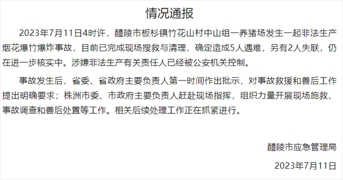 ·11日,湖南醴陵發(fā)生一起非法生產(chǎn)煙花爆竹爆炸事故,造成5人遇難,2人失聯(lián),涉嫌非法生產(chǎn)有關(guān)責(zé)任人已被公安機(jī)關(guān)控制,案件仍在進(jìn)一步核實(shí)中。