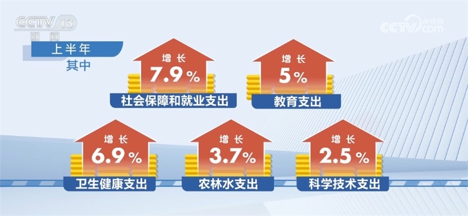 從支出看,上半年,全國一般公共預(yù)算支出133893億元,同比增長3.9%。其中,社會(huì)保障和就業(yè)支出增長7.9%,教育支出增長5%,衛(wèi)生健康支出增長6.9%,農(nóng)林水支出增長3.7%,科學(xué)技術(shù)支出增長2.5%,基本民生、鄉(xiāng)村振興、區(qū)域重大戰(zhàn)略、教育、科技攻關(guān)等重點(diǎn)支出得到有力保障。