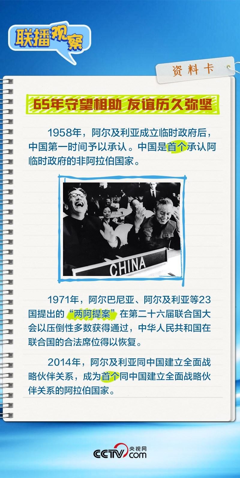 會(huì)談中,習(xí)主席特別提到,今年是中國向阿爾及利亞派遣醫(yī)療隊(duì)60周年,并稱贊此舉樹立了“中阿友誼的豐碑”。中阿傳統(tǒng)友誼深厚,兩國始終相互尊重、平等相待、彼此支持,締造了一段段友好交往的佳話。