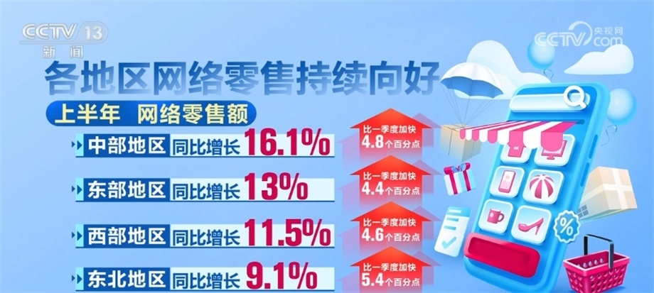 各地區(qū)網(wǎng)絡(luò)零售持續(xù)向好。上半年,中部、東部、西部和東北地區(qū)網(wǎng)絡(luò)零售額同比分別增長16.1%、13%、11.5%和9.1%,比一季度分別加快4.8、4.4、4.6和5.4個百分點。