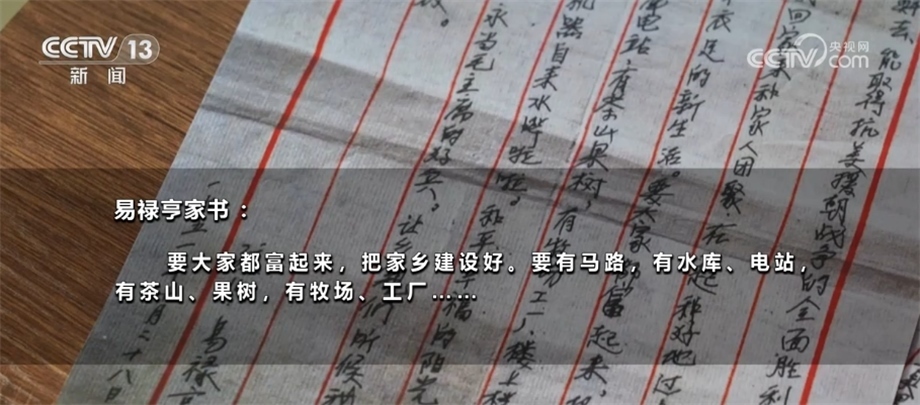 抱著與家人訣別的心情,年輕的易祿亨寫下了這封家書。除了戰(zhàn)場上的見聞和對家人的思念,他還寫下了對未來美好生活的憧憬:要大家都富起來,把家鄉(xiāng)建設(shè)好。要有馬路,有水庫、電站,有茶山果樹,有牧場、工廠……作為家中長子,瞞著父母走上戰(zhàn)場,易祿亨一直心懷愧疚。他希望通過這些文字,能讓父母理解自己的決定。