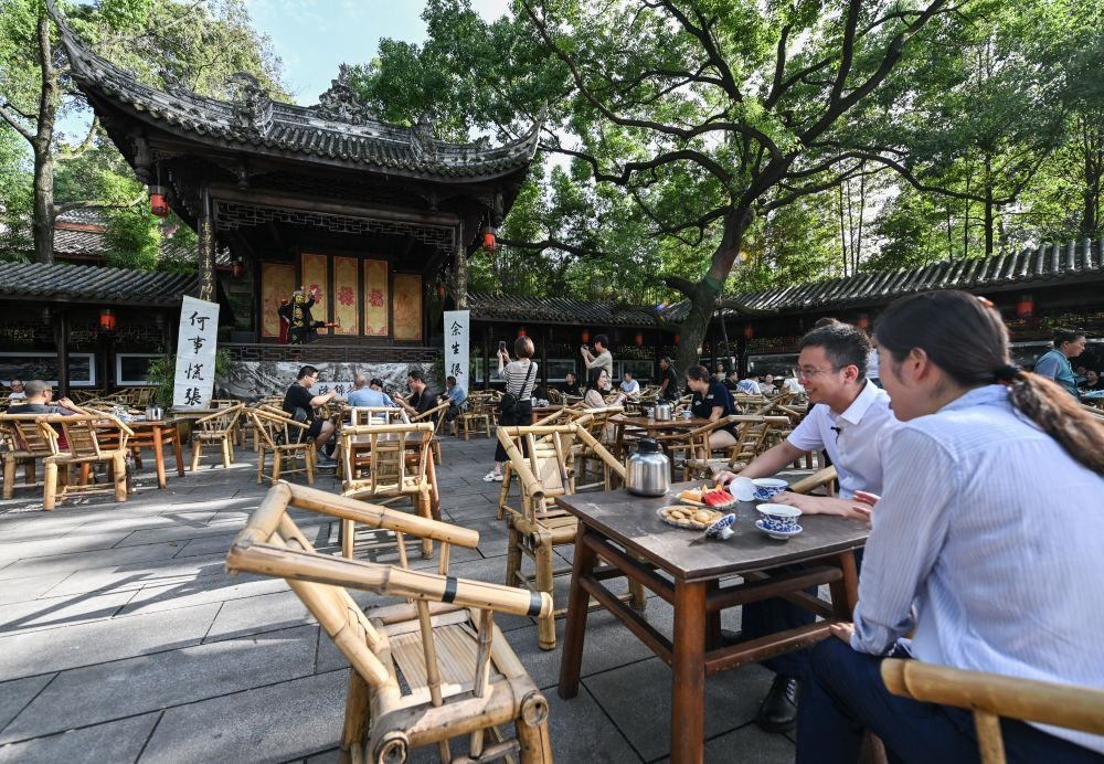 7月14日,在成都高新區(qū)鐵像寺水街,游客在茶鋪體驗當?shù)靥厣w碗茶。新華社記者 王曦 攝