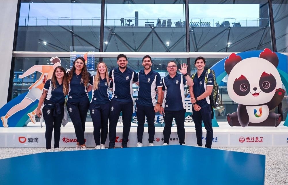 7月17日,首批抵蓉的巴西代表團成員在成都天府國際機場合影留念。新華社記者 胥冰潔 攝
