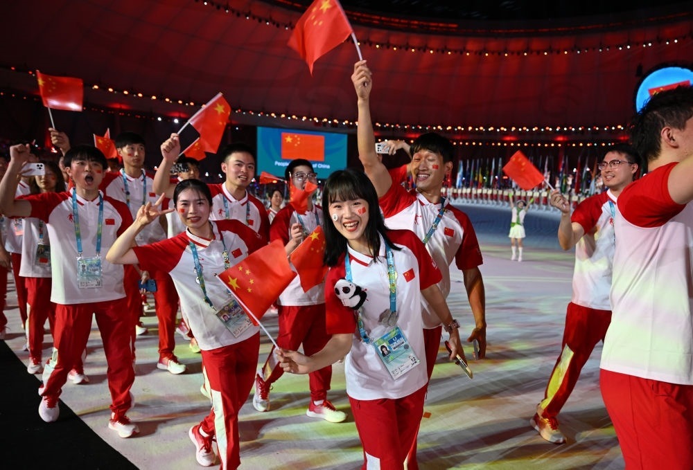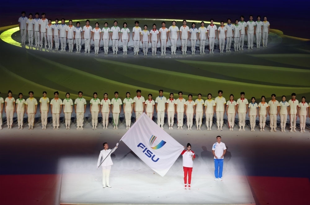 中國大學(xué)生體育代表團(tuán)在開幕式上入場(chǎng)。