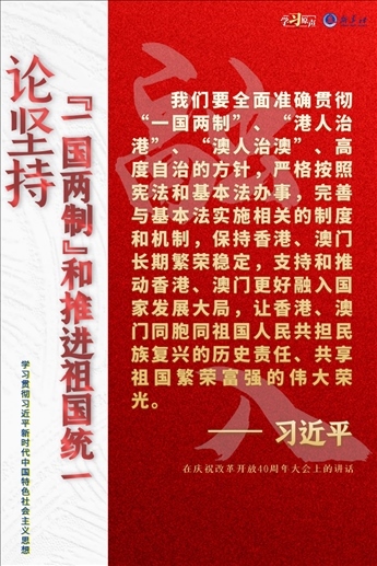 “一國兩制”是黨領(lǐng)導(dǎo)人民實(shí)現(xiàn)祖國和平統(tǒng)一的一項重要制度,是國家的一項基本國策。中國特色社會主義進(jìn)入了新時代,意味著“一國兩制”事業(yè)也進(jìn)入了新時代。不斷推進(jìn)“一國兩制”在香港、澳門的成功實(shí)踐,是中華民族偉大復(fù)興歷史進(jìn)程的重要組成部分。