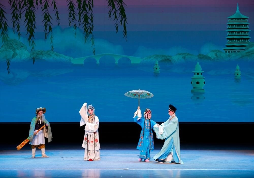 8月5日,來自成都市京劇研究院的演員表演《白蛇傳·游湖》。新華社記者沈伯韓攝