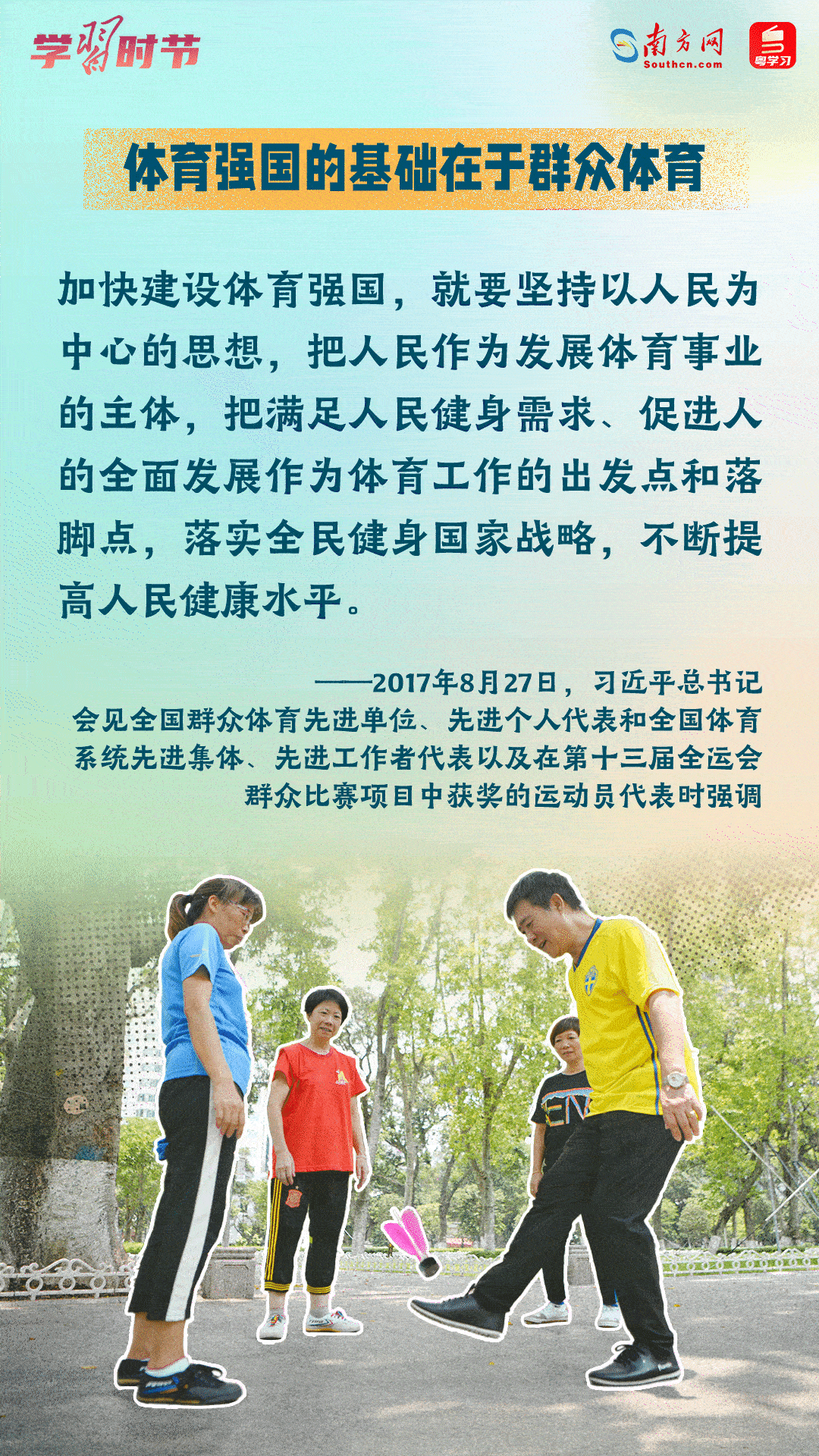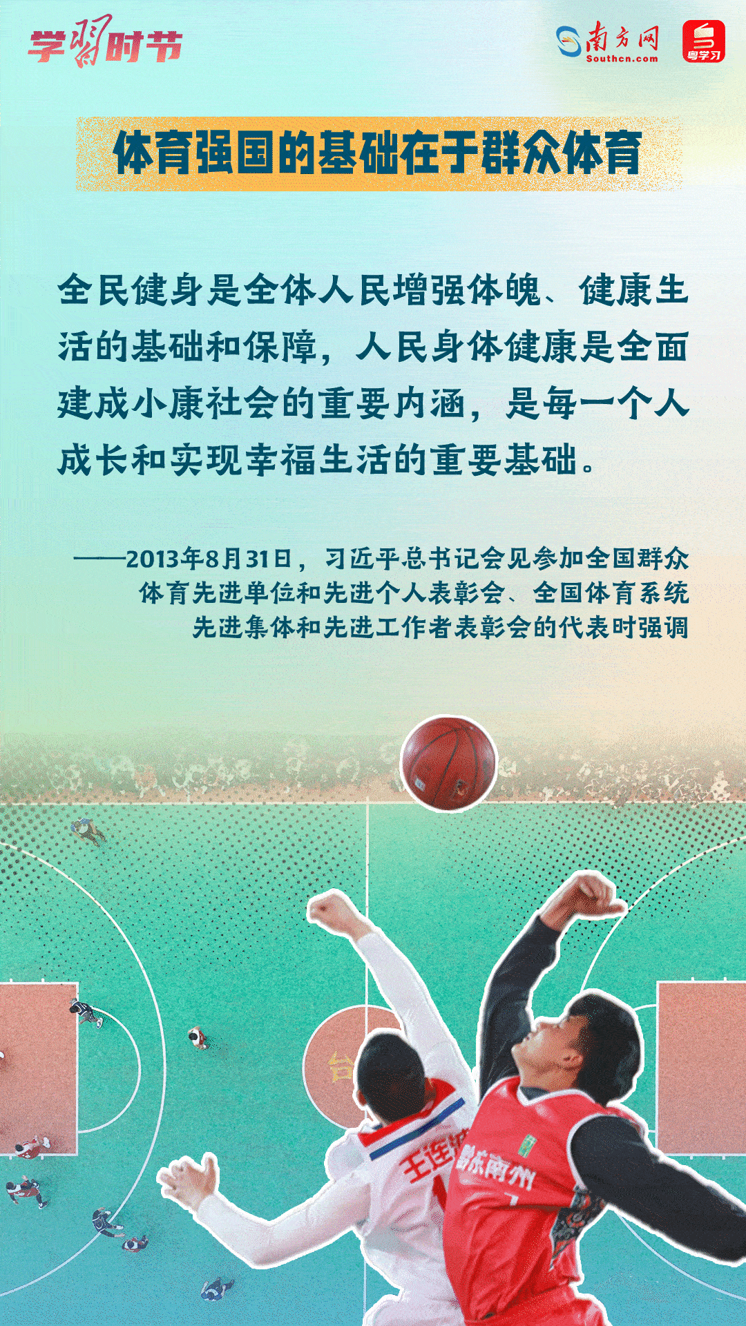 今年8月8日是我國(guó)第15個(gè)“全民健身日”,讓我們學(xué)習(xí)領(lǐng)悟習(xí)近平總書(shū)記關(guān)于推進(jìn)全民健身的重要論述,一起加入全民健身的隊(duì)伍中,通過(guò)健身收獲健康、收獲快樂(lè)!