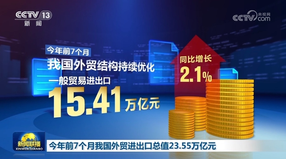 央視網(wǎng)消息(新聞聯(lián)播):海關(guān)總署今天(8月8日)對外公布,今年前7個月,我國貨物貿(mào)易進(jìn)出口總值23.55萬億元,外貿(mào)運行平穩(wěn)、符合預(yù)期。