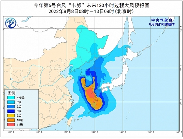 大風預報:預計8-11日,受“卡努”影響,渤海東部、渤海海峽、黃海、東海、臺灣海峽、浙江南部沿海、福建北部沿海、臺灣島北部沿海將有6~8級、陣風9~10級的大風,其中黃海中部和南部偏東海域、東海東部部分海域風力可達9~10級、陣風11~12級,“卡努”中心經(jīng)過的附近海面風力有11~12級、陣風13~14級;10-13日,東北地區(qū)及山東半島沿岸海域有4~5級風、陣風6~7級,黑龍江和吉林的部分地區(qū)有6~7級風、陣風8~9級,局地風力可達8~9級、陣風10~11級。