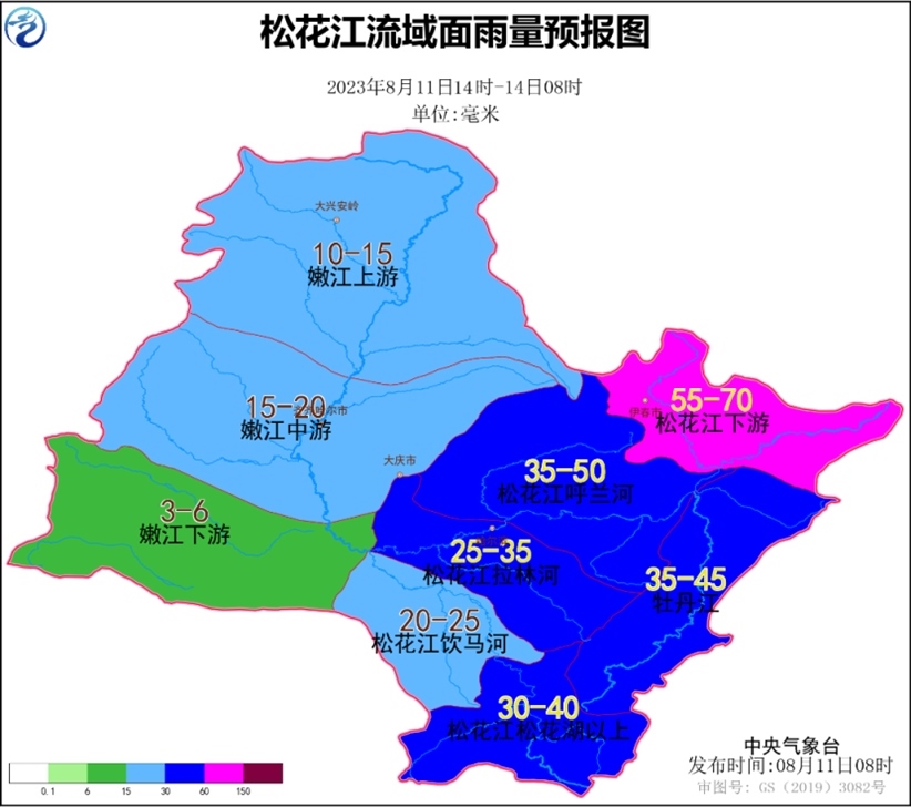 松花江流域面雨量預(yù)報:11日下午至13日,松花江流域中東部面雨量20~55毫米,其中松花江下游面雨量55~70毫米;鴨綠江、圖們江、綏芬河子流域面雨量40~45毫米。
