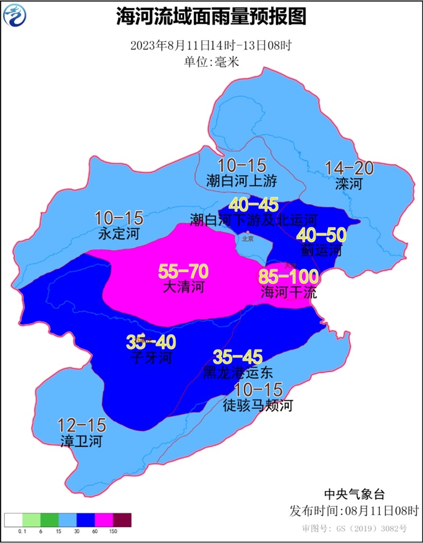 海河流域面雨量預(yù)報:11日下午至12日,海河流域中部子流域面雨量35~50毫米,其中大清河面雨量55~70毫米、海河干流85~100毫米。