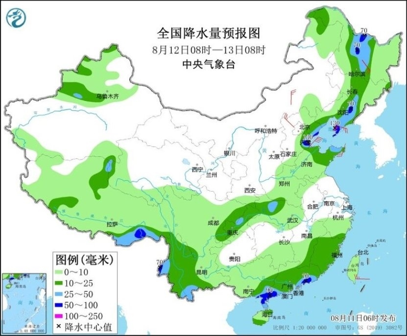 降雨預(yù)報:11日下午至13日,遼寧、吉林、黑龍江等地部分地區(qū)有大到暴雨,局地有大暴雨;大部地區(qū)累計雨量30~80毫米、局地100~150毫米,遼寧東部局地將超過200毫米。具體預(yù)報如下: