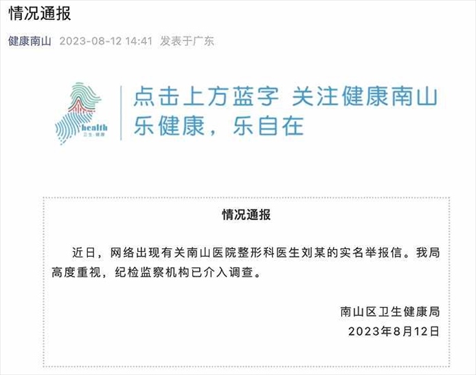 ·網(wǎng)傳南山醫(yī)院整形科醫(yī)生劉某被實名舉報,官方通報:紀檢監(jiān)察機構已介入調(diào)查。