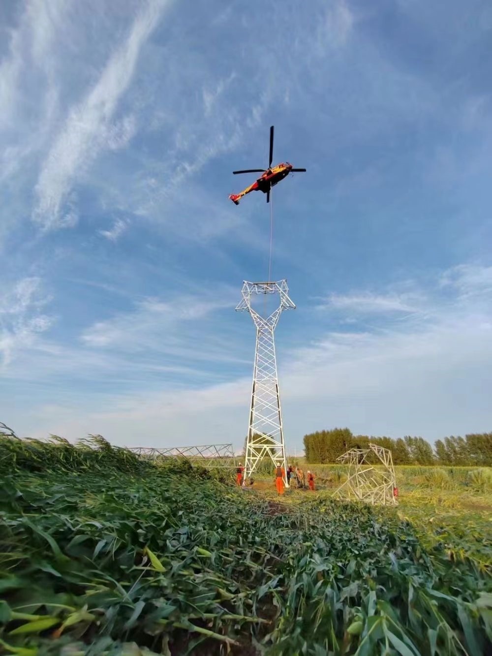 9日,在海林市110千伏長海輸電線路搶修現(xiàn)場,一架直升機吊裝起沉重的輸電鐵塔,運送到指定地點。這個輸電鐵塔處于河流中心島位置,無法使用常規(guī)起重設備。國家電網(wǎng)公司迅速從國網(wǎng)遼寧電力、國網(wǎng)空間技術公司等單位調配直升機支援黑龍江,解決輸電鐵塔吊裝、運輸?shù)葐栴}。