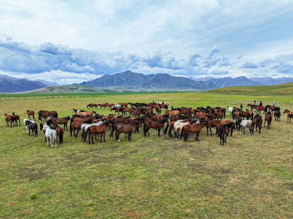 △甘肅山丹馬場,成群的駿馬在歡騰覓食。