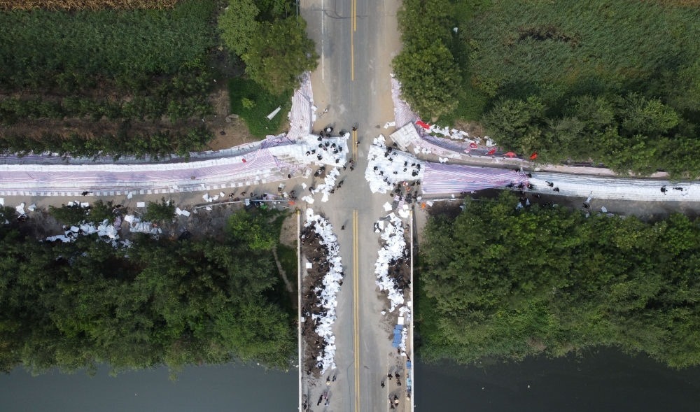 武警第一機(jī)動總隊某支隊官兵在大清河支渠橋處搶筑堤壩(8月10日攝,無人機(jī)照片)。新華每日電訊記者趙子碩攝