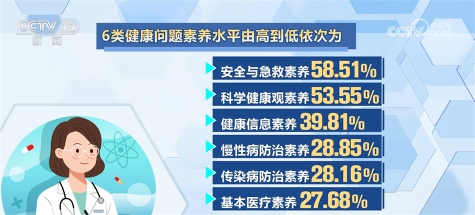 6類健康問題素養(yǎng)水平由高到低依次為:安全與急救素養(yǎng)58.51%、科學(xué)健康觀素養(yǎng)53.55%、健康信息素養(yǎng)39.81%、慢性病防治素養(yǎng)28.85%、傳染病防治素養(yǎng)28.16%和基本醫(yī)療素養(yǎng)27.68%。各類健康問題素養(yǎng)均有不同程度提升,其中,健康信息素養(yǎng)水平增幅最大,較2021年提升了3.88個百分點。本次監(jiān)測覆蓋31個?。ㄗ灾螀^(qū)、直轄市)的336個縣(區(qū))1008個鄉(xiāng)鎮(zhèn)(街道),對象為15—69歲常住人口。