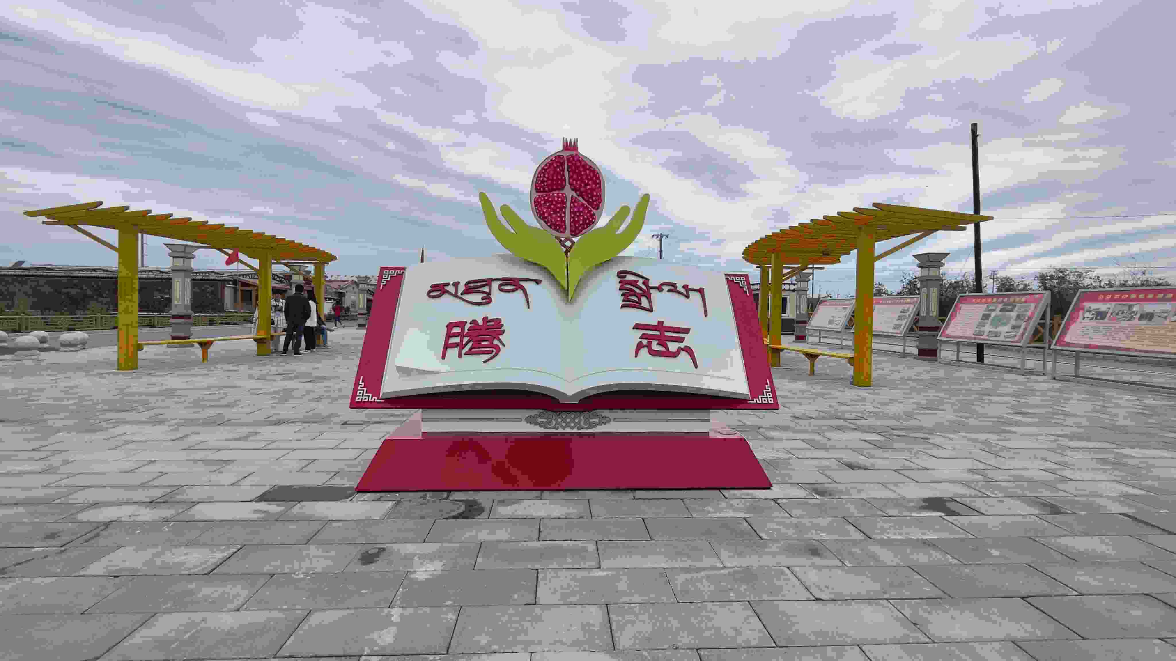 這些向好的變化離不開(kāi)每一位村民的團(tuán)結(jié)友愛(ài)、互幫互助。村口的廣場(chǎng)中間有一本打開(kāi)的書,書頁(yè)上一雙手托舉著一個(gè)鮮艷的石榴,這就是果洛藏貢麻村新修建的“騰志”廣場(chǎng)?!膀v志”在藏語(yǔ)中意為“團(tuán)結(jié)”,這也寓意著各民族像石榴籽一樣緊緊抱在一起,共育團(tuán)結(jié)花,共享幸福果。
