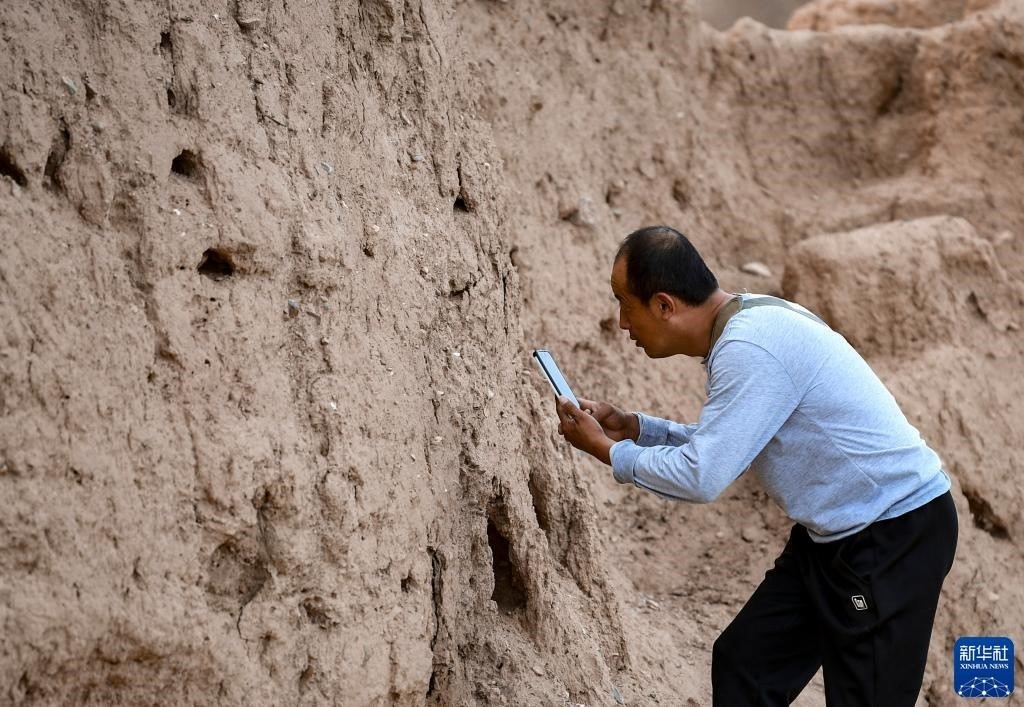 8月20日,董海寧巡查賀蘭山沿線的明長城永寧段時(shí)用手機(jī)拍照記錄。新華社記者 連振 攝