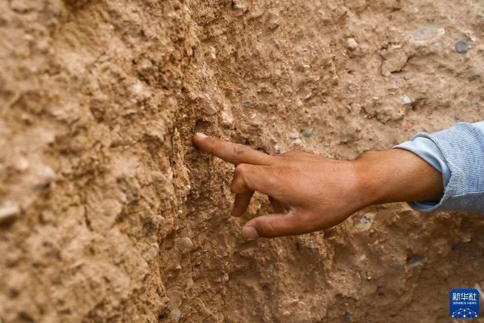 8月20日,董海寧介紹長城墻體修建時(shí)用到的芨芨草。新華社記者 劉金海 攝