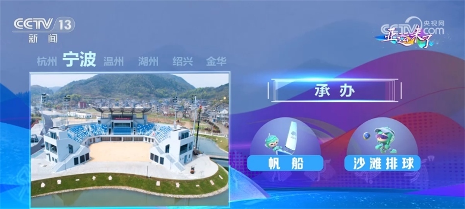 寧波設(shè)2個場館和1個亞運(yùn)分村,承辦帆船和沙灘排球項(xiàng)目;溫州設(shè)3個場館和1個亞運(yùn)分村,承辦足球小組賽和龍舟項(xiàng)目;湖州設(shè)2個競賽場館,承辦排球和三人制籃球項(xiàng)目;紹興設(shè)4個場館,承辦籃球、排球、攀巖、棒壘球項(xiàng)目;金華設(shè)3個場館和1個亞運(yùn)分村,承辦足球小組賽和藤球項(xiàng)目。