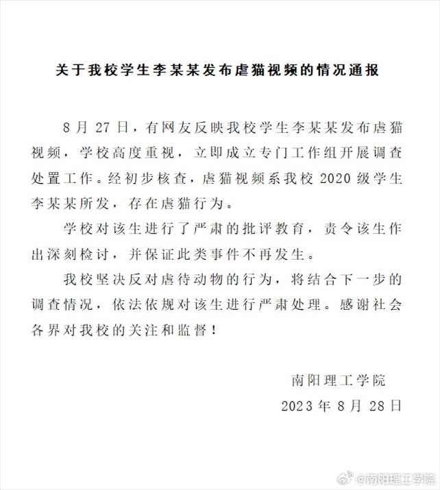 ·南陽理工學院通報“學生發(fā)布虐貓視頻”:責令其作出深刻檢討,將進行嚴肅處理。