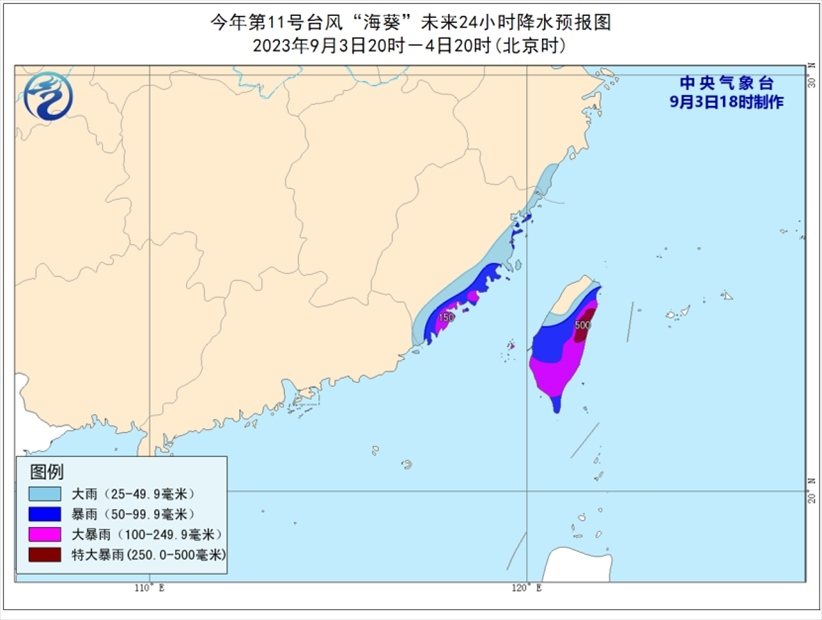 降水預(yù)報(bào):9月3日20時(shí)至4日20時(shí),福建東部、浙江東南部沿海、臺(tái)灣島等地有大到暴雨,其中,福建東南部沿海、臺(tái)灣島東部和南部等地部分地區(qū)有大暴雨,臺(tái)灣島東部局地特大暴雨(250~500毫米);上述地區(qū)最大小時(shí)降雨量20~50毫米,局地可超過(guò)60毫米,局地還有雷暴大風(fēng)等強(qiáng)對(duì)流天氣。