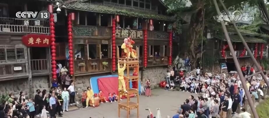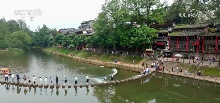 在四川洪雅縣的柳江古鎮(zhèn),當地推出實景演出、經典誦讀、非遺巡演等多項活動。游客們漫步于山水如畫的詩意古鎮(zhèn)中,觀看水上實景演出,感受非遺民俗魅力,歡度假期。