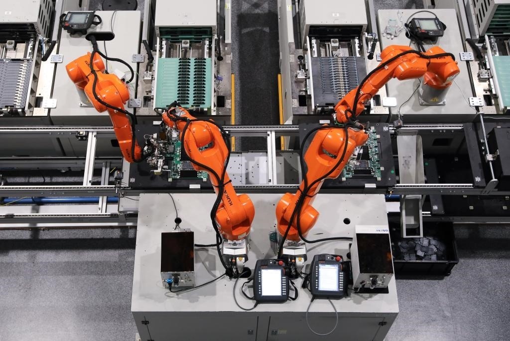 5月22日,在杭州紫光恒越(杭州)技術(shù)有限公司“未來工廠”,機(jī)械臂在工作中。新華社記者 杜瀟逸 攝