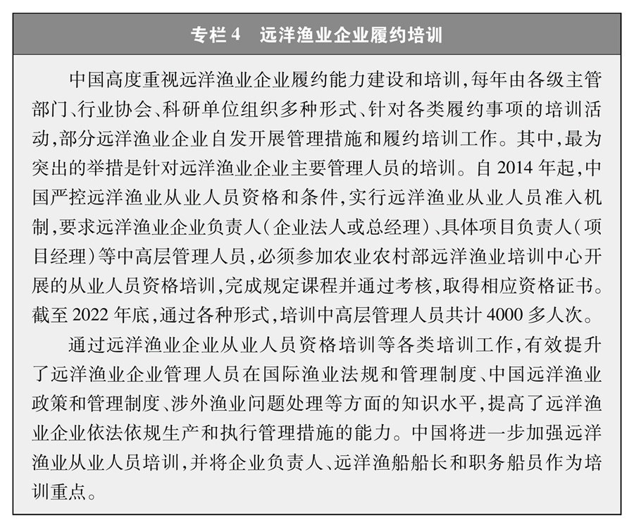 遠(yuǎn)洋漁業(yè)企業(yè)和漁船是履行國(guó)際公約、合法合規(guī)從事漁業(yè)生產(chǎn)的主體。2022年中國(guó)正式實(shí)施遠(yuǎn)洋漁業(yè)企業(yè)履約評(píng)估制度,將企業(yè)履約成績(jī)與行政審批、政策支持等掛鉤,通過(guò)正向激勵(lì)、反向倒逼的方式,引導(dǎo)企業(yè)不斷完善管理制度,嚴(yán)格執(zhí)行管理措施,避免發(fā)生違規(guī)行為,切實(shí)提高履約能力。這一制度有力促進(jìn)了遠(yuǎn)洋漁業(yè)企業(yè)規(guī)范管理和國(guó)際履約,得到了各方關(guān)注和廣泛認(rèn)可。