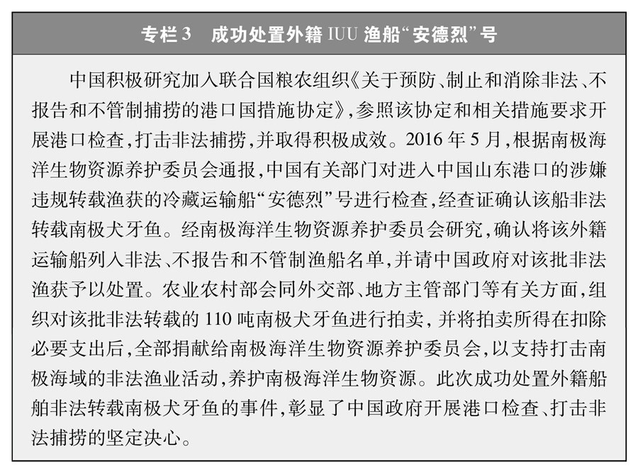 堅(jiān)決支持并積極配合國(guó)際社會(huì)打擊各種非法漁業(yè)活動(dòng)。2020年起,中國(guó)每年派遣執(zhí)法船赴北太平洋公海開(kāi)展?jié)O業(yè)執(zhí)法巡航,查處違規(guī)作業(yè)行為。2016年,配合南極海洋生物資源養(yǎng)護(hù)委員會(huì)成功扣押處置了一艘外籍漁船非法轉(zhuǎn)載南極犬牙魚(yú)案件。2018年起,將中國(guó)加入的相關(guān)區(qū)域漁業(yè)管理組織公布的非法、不報(bào)告和不管制漁船名單通報(bào)國(guó)內(nèi)各港口,拒絕此類(lèi)漁船進(jìn)港以及卸貨、補(bǔ)給、加油等活動(dòng)。
