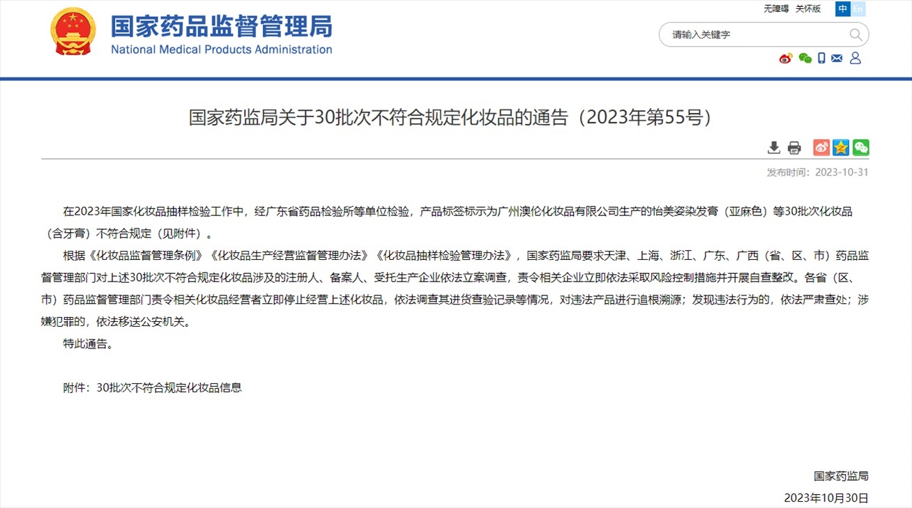 ·國家藥監(jiān)局發(fā)布通告,化妝品抽樣檢驗發(fā)現(xiàn)30批次化妝品(含牙膏)不符合規(guī)定。
